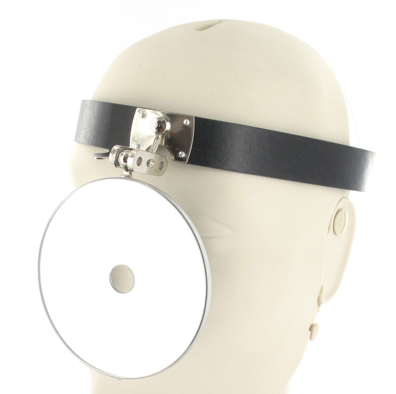 Miroir concave à revêtement argent, 90 mm de diamètre avec trou de 13 mm de diamètre, sur bandeau réglable. Une monture spéciale permet le remplacement du miroir en verre en cas de casse. Fabriqué en Allemagne.