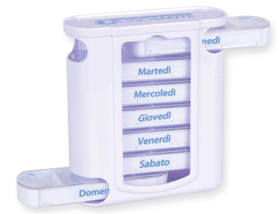 Tour pilulier avec 7 boîtes détachables, chacun avec 4 petits compartiments (matin, midi, soir et nuit).